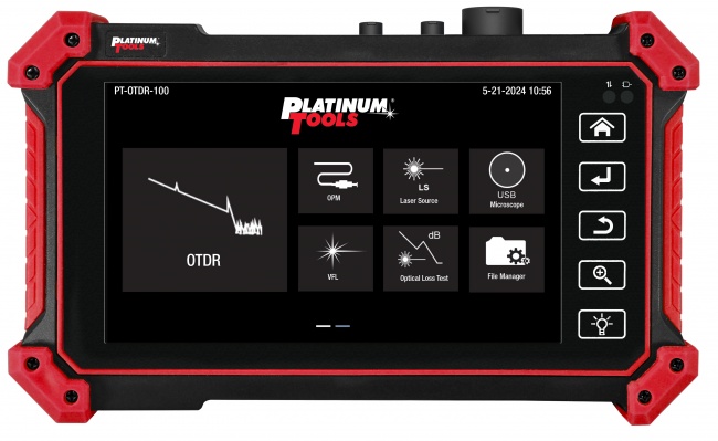 The PT-OTDR-100 mini OTDR tester provides a simple to setup and easy to use solution for OTDR testing. Includes a 5.5 inch OLED touch screen for easy viewing of cable tests and can save and export your OTDR tests. This unit will perform OTDR tests, OPM, VFL and laser source functionality for fiber optic cable, and will also perform continuity testing and TDR for Category cable