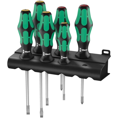 6-piece screwdriver set with Kraftform Plus handle for pleasant, ergonomic working that prevents blisters and calluses. Hard gripping zones for high working speeds whereas soft zones ensure high torque transfer. Partially Lasertip: the tip literally bites into the head of the screw and thereby prevents any slipping out of the screw head. Take it easy Tool Finder: colour coding according to profile and size. The hexagonal anti–roll feature prevents any bothersome rolling away at the workplace. Includes practical rack for tidy storage of the screwdrivers.