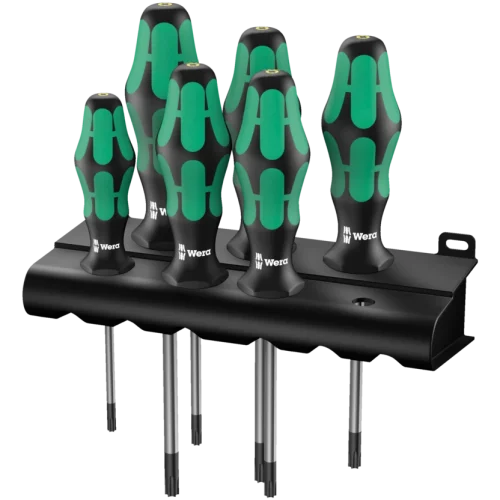 6-piece screwdriver set with Kraftform handle for pleasant, ergonomic working that prevents blisters and calluses. TORX® BO screws have a protruding pin in their drive profile. This prevents any unauthorised loosening since the “normal” hex tools cannot move these screws. Only special TORX® BO tools have a bore hole which can slip over the pin. The Wera Black Point tip and a complex hardening process ensure a long service life of the tip, enhanced corrosion protection and an exact fit. The hexagonal anti-roll feature prevents any bothersome rolling away at the workplace. Handle markings for simplified finding and sorting of the tool. Includes a practical rack for tidy storage of the screwdrivers