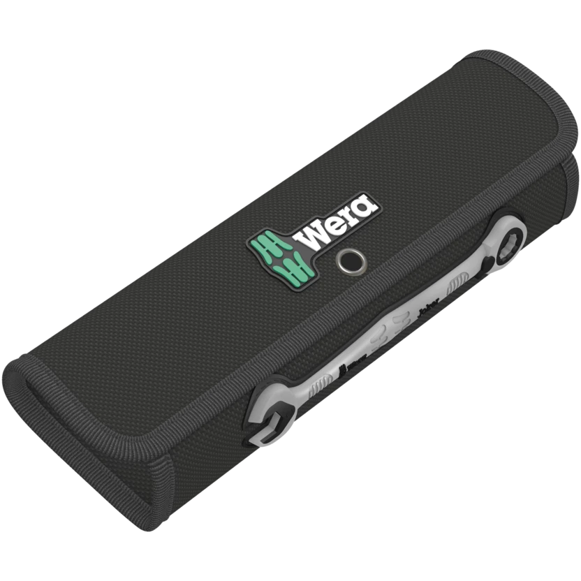 High quality combination ratchet wrench set by Wera: everything that a wrench has to be able to do. And a whole lot more. Faster, better, stylish. Yes, a real Joker. The new generation of combination ratchet wrenches. 6-piece set in a robust pouch. 4 wrenches with open end and ring end in the same dimension; 2 wrenches with a jaw at both ends in different dimensions. Suitable for hexagon bolt heads or nuts. Comes with a holding function, thanks to the metal plate in the jaw, which reduces the risk of dropping nuts and bolts. The replaceable metal plate in the jaw secures nuts and bolts with its extra hard teeth and limits the danger of slipping. The integrated limit stop prevents any slipping down around the bolt head and allows higher torque to be applied. The double-hex geometry makes for a positive connection with nuts or bolts and reduces the risk of slipping. A return angle of only 30° at the open end prevents any time consuming flipping of the wrench during fastening jobs. The ratchet mechanism at the ring end, with an exceptional, fine-tooth mechanism – 80 teeth in all – enables flexibility even in very confined working spaces. The specially forged geometry provides for high torque transfer and strength. Manufactured out of high performance chrome molybdenum steel with a nickel-chrome coating for high corrosion protection. Take it easy Tool Finder with colour coding according to sizes.