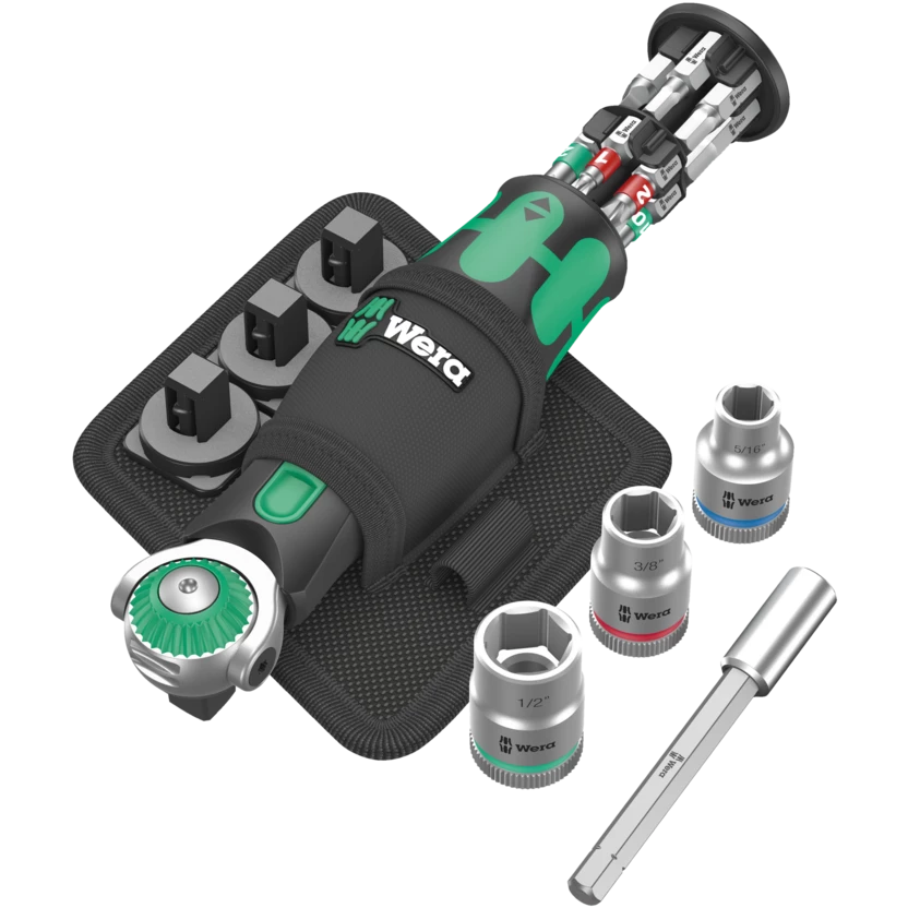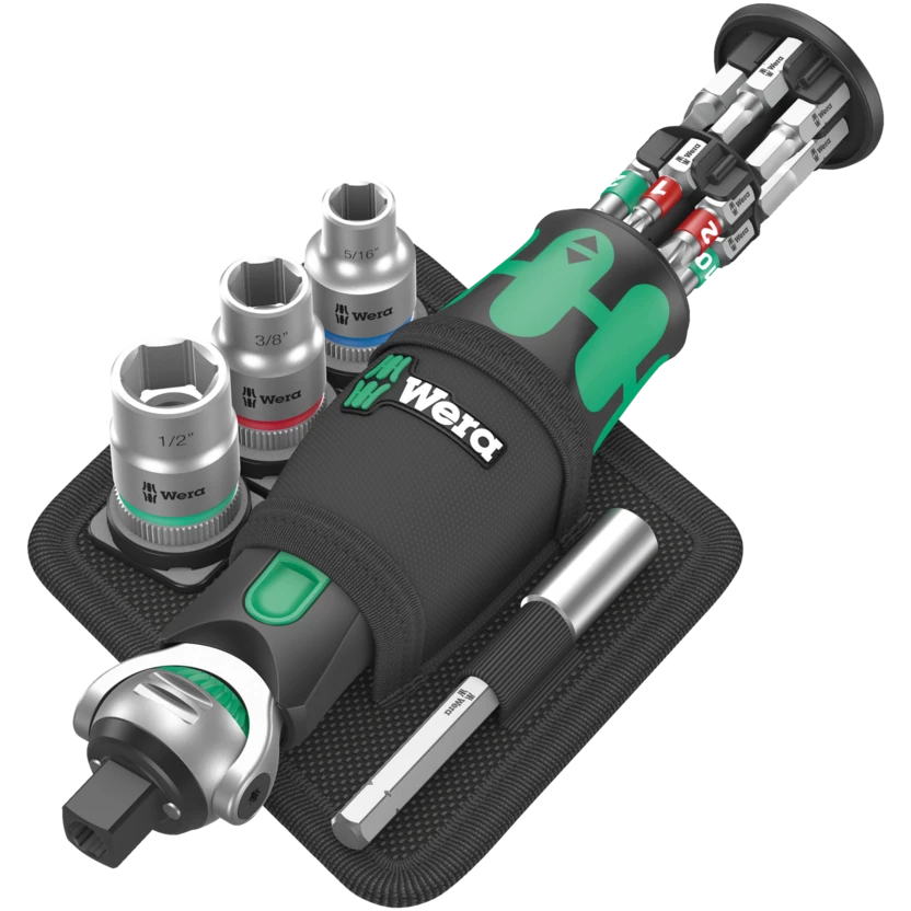Compact Zyklop ratchet with bit magazine for the pocket. Magnetic direct mounting for ¼” hex drive bits and 3/8″ sockets. Rapid tool change thanks to the non-locking mounting. As the head is lockable at 0°, 15° and 90°, the tool can be used as a ratchet and as a ratchet screwdriver. The fine toothing with 72 teeth allows for a low return angle of 5°. Wide range of applications thanks to 12 bits integrated in the handle. The robust ratchet mechanism allows for ample torque. Perfect combination of a Zyklop ratchet with a 12-piece screwdriver set. The 75 mm long universal holder for 1/4″ hex drive bits can be used as an extension. Including sockets in the commonest dimensions. One robust textile holster 9468 to be attached to the belt and docked onto the Wera 2go system.