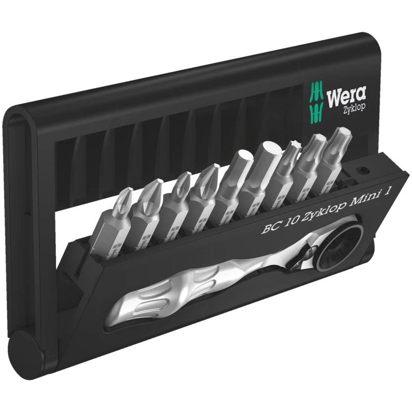 Many tools in a minimum of space. The sorting according to drive and size allows rapid accessing of the bits. The Wera Mini ratchet: drop-forged, full-steel design. Fine-pitched mechanism with 60 teeth that allows a small return angle of only 6° for precise work. Simple left/right switchover. Ergonomically-designed ratchet head and lever.