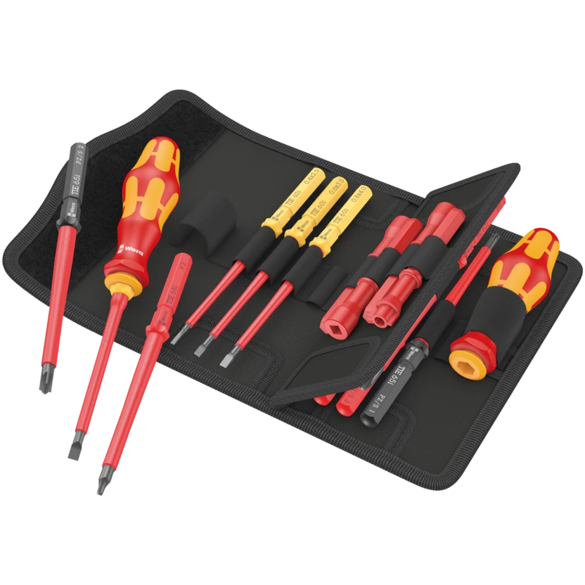 2x 817 VDE Kraftform bitholding screwdrivers, 12 VDE blades with Take it easy Tool finder: Colour coding by profile and laser-engraved size indication – for quick and easy identification of the required tool. 4 control cabinet keys. Individually tested at 10,000 V for safe working at the approved voltage of 1,000 V. In a robust belt pouch. The textile box features a fleece zone at the back. Using the provided self-adhesive hook and loop fastener strips, the textile box can be attached to the Wera 2go components. Or to the wall, shelf or workshop trolley.