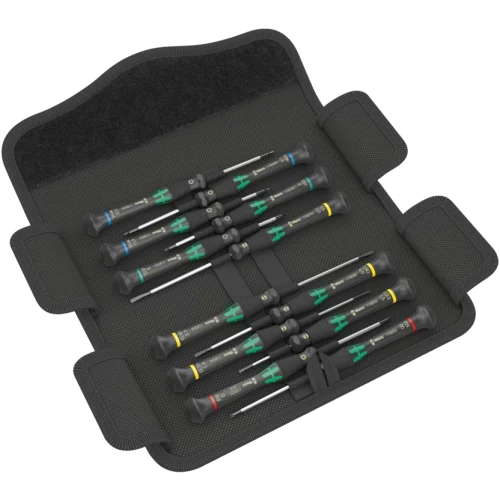 Wera Micro screwdriver set for precision mechanical work. Rapid twisting results from fixing the hand on the head and using the fast-turning zone just below. This makes time-consuming grip adjustments unnecessary. Storage and transport in a robust belt pouch – so the tool is always at hand.